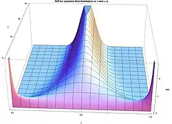 Several authors, including N. L. Johnson and S. Kotz,[1] use the symbols and (instead of and ) for the shape parameters of the beta distribution, reminiscent of the symbols traditionally used for the parameters of the Bernoulli distribution, because the beta distribution approaches the Bernoulli distribution in the limit when both shape parameters and approach zero.