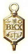 The Beta Kappa Chi key designed by charter member John Martyne Howe.[4] Its key is shaped like a benzene ring with the Greek letters ΒΚΧ and a clover leaf above the Β, a skull and crossed bones above the Κ, and a circle above the Χ. There is a retort below the Β, a balance below the Κ, and scroll with stencils below the Χ.[1][7][11]