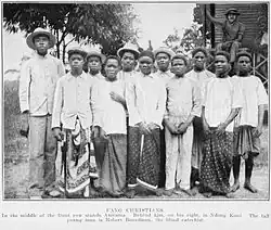 The Beti-Pahuin peoples organised themselves according to a series of patrilineal kinships, although some of its subgroups seem to have practiced matriliny in the past.[2] As a consequence of this matrilineal past we can still nowadays see the strong link among the maternal uncle and the nephew.[2][3] The family (a man, his wife or wives, and his children) forms the backbone of this system. Several families of a common lineage live together in a village, and in turn, several related villages form a clan. These clans come under the nominal rule of a chief, who is also traditionally regarded as a religious authority.