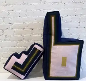 In 2018, Kaufman expanded her interest in form and color to include volume, creating needlepoint sculptures referencing pillows as a humorous device; she also produced one-inch-thick works she termed "drawings in needlepoint."[3][26] She exhibited this work in "14 Sculptures, 1 Painting" (Leslie Tonkonow, 2022), displaying the sculptures on pedestals and platforms. Hyperallergic writer Ela Bittencourt contended that the sculptures "coaxed humor and joy" out of analytical styles such as constructivism and likened them to work by Sophie Taeuber-Arp and Eva Hesse that undermined modernist sculptural hierarchies such as the privileging of fine over applied arts or hard, rigid form over soft.[3] She wrote that the "domestic" works pushed "the grid’s implausible pliability until it gives, causing 'slippage' or sag ... corners bend, squares bulge out of their frames, asymmetries get thrown off by bits of plushy excess."[3] This body of work was also exhibited at Pace Gallery and Hunter Dunbar Projects in New York in 2022.[26][32]