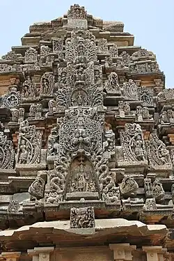 The outer wall of the temple has projections and recesses creating niches. In these niches are miniature decorative towers in relief (called aedicula or turrets), the execution of which evolved during the Later Chalukya rule. The Vesara style aedicula are supported by double pilasters while the Dravida (south Indian) style aedicula is supported by single pilasters. The art historian Percy Brown calls the Later Chalukyan style of wall decoration "exceptionally well rendered", and according to Kamath, the miniature towers are wrought in a "most artistic refrain".[5] Each tier of the superstructure has a kirtimukha (gargoyle like face). Below each kirtimukha, is a relief of a deity such as the Nataraja or Maheshvara (both forms of the Hindu god Shiva). Worthy of mention is the ornate relief on the lintel and door jamb at the entrance to each sanctum (garbhagriha) which exhibit Saiva dvarapalas ("guardians" to a shrine of the god Shiva) flanked by female umbrella (chauri) bearers. Facing the west sanctum is a small sculpture of Nandi the bull. There are sculptures of various deities from the Hindu pantheon in the niches in the interior wall of the temple, such as Ganesh (elephant headed god of "beginnings" in Hinduism), Mahishasuramardhini (a form of Durga) and the Saptamatrika (the seven Hindu goddesses). The ceiling in the common hall is supported by four polished lathe turned pillars, which according to Kamath is also a characteristic feature of Western Chalukya temples.[4]