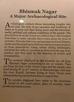 Bhismaknagar is an important ancient archeological site. The site was one of the stronghold of the Chutia Kingdom. The ruins have been dated between the 11th-15th centuries.[9] Bhismaknagar has been identified with Sadhayapuri (or Svadhayapuri), the political centre of the Chutia Kingdom.[10] Based on an inscriptions on brick, it is assumed to have been the capital of Chutia king Lakṣmīnārāyaṇa, of the early 15th century. Paleographical analysis supports this dating.[11]