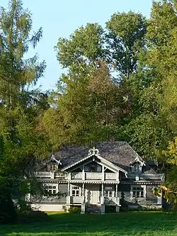 The rapid development of Białowieża took place after 1888, when the settlement was incorporated into tsarist estates. In 1889–1894 a large hunting palace was built, designed by Nicholas de Rochefort. A number of buildings were built in the vicinity of the palace: The Świcki (Hunting House) with comfortable, separate rooms, a common billiard room, baths for the tsar's dawn (burned down in 1962), the Hofmarszałkowski House for court marshals (built in 1904), kitchen buildings, palace stable for 40 horses, laundry, telephone station, power plant (demolished in 1978), electric mill, house for servicing horses, house of the palace supervisor, house of shooters (built in 1904), woodcutter, cold store, bakery, house for preparation of forest animals, etc. As a result, a large housing estate was created. In 1895, an English-style palace park was created with an area of approximately 50 ha, designed by Walerian Kronenberg. At that time, another park with an area of 20 ha was established in another part of Białowieża, also according to the design of Kronenberg, surrounding the seat of the Board of the Appanaged Forest. Originally called a regiment, in the interwar period it received the name of the Directorate Park, which is preserved until today. Seven clerical houses were built in this area. In 1895, construction was completed and a new stone church of St. Nicholas the Wonderworker, located near the palace.[2]