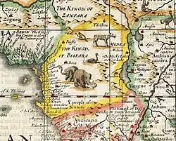 Early modern maps of Africa from the 15th to the 19th centuries, drawn from accounts written by explorers and travellers, show references to Biafar, Biafara, Biafra,[14][15] and Biafares.[16] According to the maps, the European travellers used the word Biafara to describe the region of today's West Cameroon, including an area around today's Equatorial Guinea. The German publisher Johann Heinrich Zedler, in his encyclopedia of 1731, published the exact geographical location of the capital of Biafara, namely alongside the river Rio dos Camaroes in today's Cameroon, underneath 6 degrees 10 min latitude.[17] The words Biafara and Biafares also appear on maps from the 18th century in the area around Senegal and Gambia.[18]
