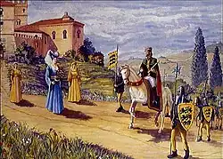 Bianca lived most of her life at the Castello di Brolo, the ancestral seat of the Lancia family. It is not known when her relationship with Frederick II began and how long it lasted. It is widely believed that her meeting with the Emperor took place in 1225, when he married Isabella II of Jerusalem. According to Renato Bordone, it is unlikely that the Emperor met her in Agliano in 1225; in fact their meeting would have taken place between 1226 and 1230 in Sicily.[6][7] In any case, the children of Bianca and Frederick II were born in the period after the death of Isabella II of Jerusalem in 1228, and before the Emperor's third marriage to Isabella of England, which took place in 1235.[2][6]