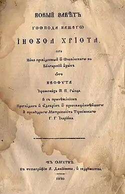 - ^ The title page reads: “The New Testament of Our Lord Jesus Christ. Now newly translated from Slavic into Bulgarian language by Neofit, Ieromonah P.P. of Rila. And diligently examined and approved by the very consecrated and wise Metropolitan of Tarnovo, Illarion. In Smyrna. In the Press of A. Damianov and Company. 1840.”