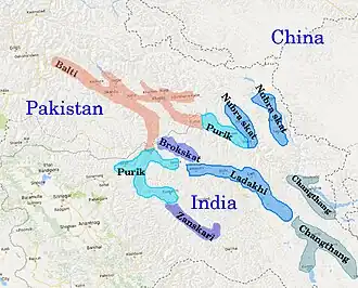 Ladakhi is a language spoken in India in regions bordering both China and Pakistan; its neighbouring languages are Purik, Balti, Zanskari, Nubra, and the more divergent Changthang (see map). All these languages are part of the Western Tibetan language grouping[4][11][12] and quite distinct from the Central, Amdo and Khams Tibetan spoken varieties.