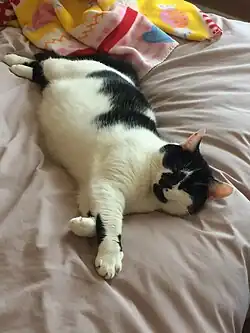 A tuxedo cat, Felix cat[5] or Julius cat is a bicolor cat with low-grade white spotting (generally close to 25% white) in the coat. The term "tuxedo cats" is typically used for black-and-white colored cats, but tuxedo patterned cats come in all cat colors. They are called tuxedo cats due to the resemblance to the black tie formal wear of the same name; however, the origins of the term "tuxedo cat" are murky at best, with linguist Cecily Raysor Hancock having been only able to track the term back to the early 1980s in America.[6]