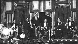 Arnold's band performed with the Dolly Sisters, who were then internationally famous and were courted by King of Denmark among others.[8] They traveled in elite circles: The Dolly Sisters in 1926 organized a gala fund raising concert and chose Arnold to organize the music. Performers included Josephine Baker and Broadway star Harry Pilcer.[9] In 1932 the Billy Arnold band was playing at the Casino in Cannes when a lion, part of an act at the Casino, "broke out of her cage and went for a stroll near the tea tables." Guests, including Lord and Lady Mountbatten and Lady Oxford and Asquith, began to panic. "Billy Arnold...sent his musicians into action again. They played frantically and the blaring strains of "Happy Days" rose above the shouts of the crowd....the lion's roars sounded above the wild playing of the orchestra and brought its trainer on the run." The trainer and his assistant managed to recapture the lion.[10]