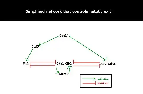 Because the behavior of cell cycle critically depends on the amount of Sic1 at the M-G1 transition state, the amount of Sic1 is tightly regulated by systems-level feedbacks. Because Cdk1-Clb2 inhibits Sic1 by phosphorylating Sic1 and making Sic1 available for degradation via ubiquitylation, APC-Cdh1-dependent degradation of Cdk1-Clb2 not only decreases the level of available Cdk1-Clb2 complexes but also increases the level of Sic1 which in turn further inhibits the function of Cdk1-Clb2.[28] This activation of the double negative feedback loop is initiated from APC-Cdc20-dependent degradation of Cdk1-Clb2 and release of Cdc14 from nucleolar protein Net1/Cfi1.[34] FEAR (Cdc14 early anaphase release) pathway facilitates Clb2-Cdk1-dependent phosphorylation of Net1 which transiently releases Cdc14 from Net1.[35] The released Cdc14 and Clb2-Cdk1 complexes go onto form spindles that activates mitotic exit network (MEN). MEN allows sustained release of Cdc14 from the nucleolus,[35] and Cdc14 counters the activity of Clb2-Cdk1 by activating Cdh1 and stabilizing Sic1 through activation of Sic1-transcriptional activator Swi5.[36] Sic1 positively regulates itself by inhibiting Cdk1-Clb2 to release inhibition of Swi5, and Cdh1 also positively regulates itself by inhibiting Clb2-Cdk1 to release inhibition of MEN which can activate Cdc14 and subsequently Cdh1 itself. The double-negative feedback loop, formed by APC-Cdh1 and Sic1, is required to maintain low Clb2-Cdk1 activity because Clb2 auto-activates its synthesis by activating transcriptional factors, Fkh2–Mcm1 Ndd1 complex.[28]
