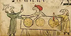 Numerous theories have been advanced to explain the choice of facial features in the Haggadah's illustrations. A prevalent theory for the use of bird rather than human faces is the illustrator's attempt to circumvent the Jews' Second Commandment's prohibition against making a graven image, in the tradition of Jewish aniconism.[25][2][21] Other Ashkenazi Hebrew illuminated manuscripts from the 13th and 14th centuries depict humans with animal heads, known as zoocephalic figures,[26][27] thought to be in keeping with this prohibition.[12] For example, parts of the Leipzig Machzor, perhaps copied by the same scribe ("Menachim") who copied the Birds' Head Haggadah,[28] feature human heads with somewhat bird-like faces. [29] The fact that some manuscripts contain both human and animal heads casts doubt on these assumptions, and it is not fully understood why zoocephalic figures appear in the haggadah and similar manuscripts.[30] In the Birds' Head Haggadah, the Jewish characters are illustrated with bird heads, while non-Jews have human heads.[31]