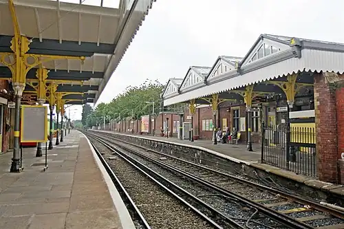 The station, described as "substantial and ornate" is on the south side of Weld Road / Liverpool Road where the road crosses the railway via a level crossing.[c] In 1890 there were booking offices and waiting rooms on both sides of the line, with gabled glazed canopies supported by iron columns, which once ran almost the full length of the platforms; sometime after 1954 they were shortened to six bays on the down platform and four bays on the up side, giving it the character of a small country town station rather than a suburban one. The two platforms were connected by a subway adjacent to the road.[d][9][10][11][12]