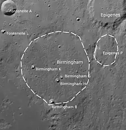 The Birmingham formation lies just to the north of the Mare Frigoris, and to the east of the walled plain W. Bond. To the northeast is the smaller crater Epigenes, with Fontenelle to the west.