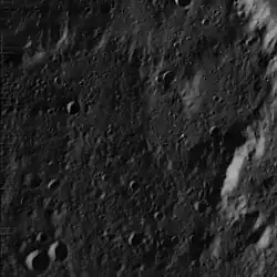 All that survives of the original formation is an irregular perimeter of low, indented ridges surrounding the lava-resurfaced interior. The inner floor is marked by several tiny craterlets, and the surface is unusually rough for a walled plain. The low angle of illumination allows fine details of this boulder-strewn field to be seen more clearly.