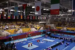 Several major national and international level sporting events has been held at the Bishan Sports Centre, including the 2009 Asian Youth Games and the 2010 Youth Olympic Games.[26] Bishan Sports Hall, which serves as the primary venue for gymnastics competitions in Singapore,[25] has hosted gymnastic competitions as part of the 2009 Asian Youth Games,[27] 2010 Youth Olympic Games[28] and the 2015 SEA Games.[29] It is also the venue for national-level gymnastics competition in Singapore.[30][31] Similarly, the 4,200-seat Bishan Stadium[32] has hosted the athletics and football competitions at the 2010 Youth Olympic Games and the 2015 SEA Games respectively.[28][29]