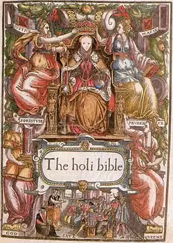 Though not formally dedicated to Queen Elizabeth, the Bishops' Bible includes a portrait of the queen on its title page. The 1569 quarto edition shows Elizabeth accompanied by female personifications of Justice, Mercy, Fortitude and Prudence.