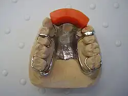Impression plaster is a historic material which can be used for bite registration. Its primary component is calcined calcium sulfate hemihydrate, which, upon mixing with water, reacts to form a rigid mass of calcium sulfate dihydrate.[16] Plaster of Paris is a plaster material used for casting impressions, impression plaster for bite registration consists of plaster of Paris with additives, more water can be added to the powder than with the casting material to provide more flow for taking the impression.[16] These additives hasten the setting time and reduce setting expansion.[16] Impression plaster advantages include having a good flow, and dimensional stability while also being accurate. However, they are brittle and prone to fracture especially where undercuts are present. They are also an untidy material with difficult handling properties.[16][15]