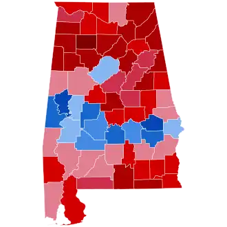 Alabama 2020 presidential election by county, Donald Trump in red, Joe Biden in blue.