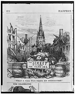 Stock prices dropped by 20 percent from September 24 to October 1, while trade was minimal. Between January 1870 and September 1870, only 4 million shares of stock were exchanged. Dozens of brokerage firms went bankrupt, those who bought paper gold from Fisk's gold room going unpaid. Farmers, who constituted 50 percent of the country's workforce, suffered the worst: wheat prices on the Chicago trade fell from $1.40 to $0.77 a bushel, corn dropped from $0.95 to $0.68, and other commodities such as rye, oats, and barley had similar losses.[31] The New York Tribune reported that goods ready for export could not be shipped.[32][31] Grant's and Boutwell's actions to break the Gold Ring, however, kept the Wall Street panic from growing into a national depression.[33] Butterfield was allowed to resign from the U.S. Treasury without an investigation in October, 1869.[34]