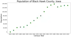 Black Hawk County is a county in the northeastern part of the U.S. state of Iowa. As of the 2020 census, the population was 131,144,[1] making it Iowa's fifth-most populous county. The county seat is Waterloo.[2]
