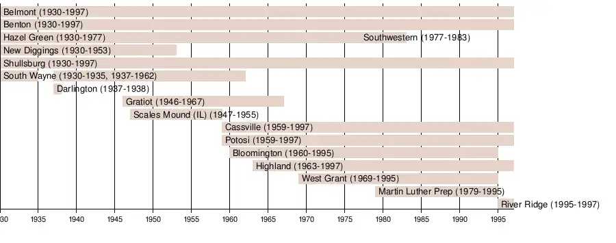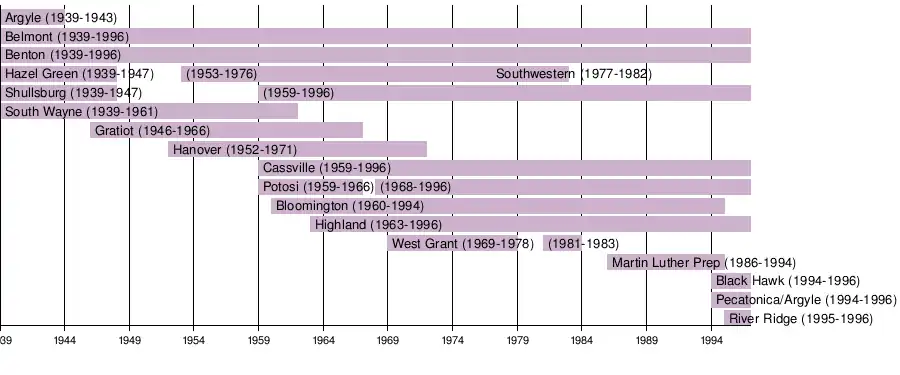 Southwestern High School's exit for the Southwest Wisconsin Athletic League brought conference membership in the Black Hawk League to nine in 1983.[19] 1995 saw an even more drastic change to membership, with a net loss of two schools in the process. Martin Luther Prep merged with Northwestern Prep in Watertown to form Luther Prep, closing the Prairie du Chien campus in the process.[20] In addition, Bloomington and West Grant were consolidated into River Ridge High School,[21][22] repurposing the West Grant High School campus for their new home. For the final two years of the conference, the Black Hawk League added former State Line members Black Hawk and Pecatonica/Argyle for football when the league ended sponsorship of that sport after the 1993 season.[23] In 1997, the seven members of the Black Hawk League merged with the nine members of the State Line League to form the new Six Rivers Conference.[24]