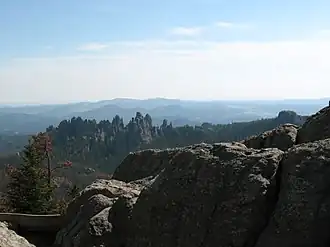 Predominantly ponderosa pine, the forest also includes hard woods like aspen, bur oak, and birch. The lower elevations include grassland prairie, but the National Forest System lands encompass most of the mountainous region known as the Black Hills of South Dakota and Wyoming. Within the forest is Black Elk Peak which is the tallest mountain in South Dakota and the highest peak east of the Rocky Mountains in the United States.[4]