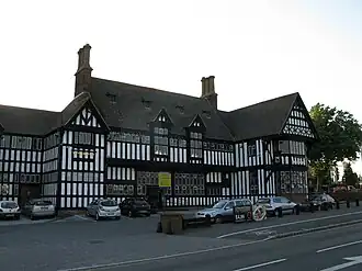 There was originally a gravelled drive for coach parties, motor vehicles, charabancs and other horse-drawn vehicles. The Black Horse is one of the largest Public houses ever built in Brewer's Tudor style.[3] There are bars, dining areas, and a replica great hall. The rear of the Black Horse is in Cotswold stone facing a terrace garden.[3]