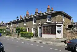 Many of the houses date back to the early nineteenth century.[2] The Anglican St Peter's Church opened in the lane in 1829.[3] The Regency era St Peter's Square, laid out in the 1820s, is directly to the west of the lane. The Victorian Westcroft Square is to the north of the lane across King Street. The lane was intersected by the Great West Road in the 1930s and the severed southern end nearest to the Thames (including the Black Lion pub) is now known as South Black Lion Lane. A number of the buildings are now listed.[4][5] The Cross Keys pub is located in the street.