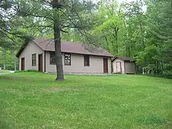 The maintenance Historic District at Black Moshannon State Park comprises four CCC-built structures and covers 2.75 acres (1.11 ha) along Munson Road, in the northwest corner of the park.[7] The storage building is a wood-frame structure with gable roofs and clapboard siding. It is similar to storage buildings built by the military during the 1930s and 1940s. A three-bay garage of standard military design is included in this historic district. It is two stories high and has clapboard siding. The gas pump house has an extended eave to protect the gas pumps, and is also a standard military design. The ranger's residence is a 1+1⁄2-story gable-roofed house with a small addition on one end. It was-sided with aluminum siding at some point after the CCC built it. There is one non-contributing structure in the district: a Maintenance Shop built in 1978.[7]