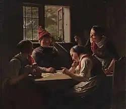 The origin of Black Peter is unclear, although legend has it that it was invented in jail by the notorious criminal, Black Peter, in 1811.[1] Its rules are recorded as early as 1821 in Das Neue Königliche L'Hombre,[8] some years before those of the English game of Old Maid or Old Bachelor whose earliest rules appeared in 1835,[9] and the French game of Vieux Garçon ("Old Boy"), first recorded in 1853.[10] It is probably much older and once a simple gambling game in which the aim was to determine a loser who had to pay for the next round of drinks (cf. drinking game).[11] An article in an 1862 issue of Deutsches Magazin says that Black Peter was originally a subgame of the student drinking game of Quodlibet which, however, is not attested before 1845.[12]