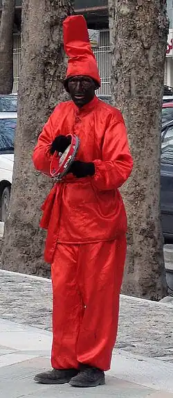 Blackface is the practice of performers using burned cork, shoe polish, or theatrical makeup to portray a caricature of black people on stage or in entertainment. Scholarship on the origins or definition of blackface vary with some taking a global perspective that includes European culture and Western colonialism.[1] Blackface became a global phenomenon as an outgrowth of theatrical practices of racial impersonation popular throughout Britain and its colonial empire, where it was integral to the development of imperial racial politics.[2] Scholars with this wider view may date the practice of blackface to as early as Medieval Europe's mystery plays when bitumen and coal were used to darken the skin of white performers portraying demons, devils, and damned souls.[3] Still others date the practice to English Renaissance theater, in works such as William Shakespeare's Othello and Anne of Denmark's personal performance in The Masque of Blackness.[4]