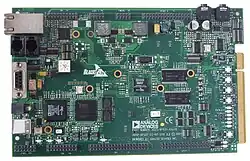 Blackfin is a family of 16-/32-bit microprocessors developed, manufactured and marketed by Analog Devices. The processors have built-in, fixed-point digital signal processor (DSP) functionality performed by 16-bit multiply–accumulates (MACs), accompanied on-chip by a microcontroller.[1] It was designed for a unified low-power processor architecture that can run operating systems while simultaneously handling complex numeric tasks such as real-time H.264 video encoding.[2][3]