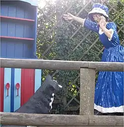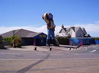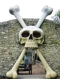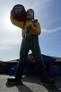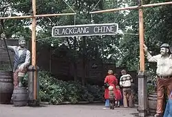 According to a May 2000 talk to the Isle of Wight Postcard Club by the then director, Mr Simon Dabell, the etymology is simply "black pathway" (the original appearance of the chine),[4] but the theme park understandably fosters the interpretation of a smuggling origin. Thus visitors to the park are greeted by a gigantic fibreglass statue of a smuggler between whose legs they could pass to enter.[5]