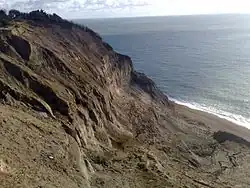 The location is based on unstable terrain owing to the underlying Gault Clay strata, resulting in a succession of huge landslips giving the area a very rugged appearance akin to the better known Jurassic Coast.[9] Currently the cliffs are eroding at a rate of about 3.5 metres per year, although this process is not gradual nor consistent.[10] Continuing landslides and coastal erosion swept away the paths in the early 1900s, and have since obliterated the chine itself and repeatedly forced the park owners to move the clifftop facilities inland.[3]