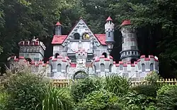 Simply named as castle in guidebooks. Located on a 1971 park map as south of nurseryland and the old entrance . A small square castle with a single cannon inside that looked out of the entrance . |