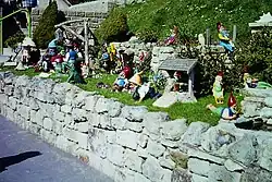 A collection of mainly German garden gnomes doing various day to day chores . Most famous are the gambling gnomes playing cards . Re sited a few times, latterly called Gnomeywood, a play on the word Hollywood . This latter version was opposite chimney pot walk . The last gnomes garden was near the current park entrance but since removed . Most gnomes are believed to now be in storage . But a few have escaped and can be found located especially in the underwater kingdom and nursery land . |