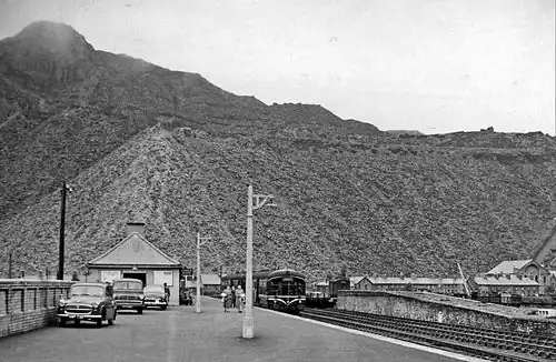 Blaenau Ffestiniog North only ever had one platform, situated to the south of the tracks. The station site was, however, extensive,[10][11][12][13][14] because it provided for conventional goods traffic and a wharf for interchange traffic with the Ffestiniog Railway, notably for slate working, but for other goods besides, particularly incoming coal. The site was bordered on one side by a huge slate waste tip,[15] as shown above right, and on a second side by a near-vertical cliff face.[16]