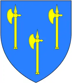 The Dennis family had been seated at Pancras Week in the parish of Bradworthy, Devon, since before the reign of King Henry II (1154-1189). The holder during that reign was Raph Dennis,[6] whose second son William Dennis founded the line of Dennis of Orleigh,[6] in North Devon. The family was of Danish origin and at the start of the age of heraldry (c.1200-1215) adopted for their arms: Azure, three Danish battle axes or. The name was created in Anglo-Norman French as le Daneis ("the Dane") and was Latinized as Dacus[1] ("Danish"), being the adjectival form of the noun Dacia, mediaeval Latin for "Denmark".