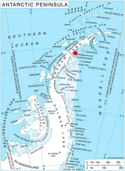 Blagoevgrad Peninsula (Bulgarian: полуостров Благоевград, romanizedpoluostrov Blagoevgrad, IPA: [poɫuˈɔstrov bɫɐˈɡɔɛvɡrɐt]) is the mostly ice-covered peninsula projecting 15 km in southeast direction from Oscar II Coast in Graham Land, Antarctica, and 17 km wide. It is bounded by Vaughan Inlet to the north and Exasperation Inlet to the south, ending in Foyn Point to the southeast. The east coast of the peninsula is indented by Yamforina Cove, and its interior is partly occupied by the southeast portion of Poibrene Heights. It was formed as a result of the break-up of Larsen Ice Shelf in the area in 2002, and subsequent retreat of the adjacent Evans Glacier and Punchbowl Glacier.