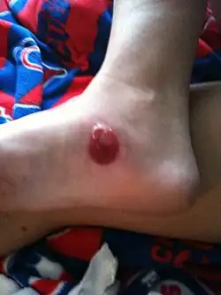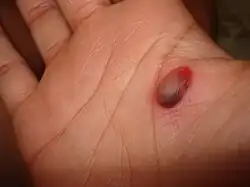 A blood blister is a type of blister that forms when subdermal tissues and blood vessels are damaged without piercing the skin. It consists of a pool of lymph, blood and other body fluids trapped beneath the skin. If punctured, it suppurates a dark fluid. Sometimes the fluids are cut off from the rest of the body and dry up, leaving behind dead cell material inside the blister with a texture like putty. Some blood blisters can be extremely painful due to bruising where the blister occurred.