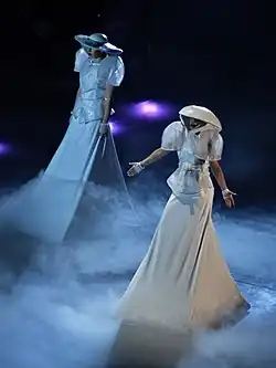 Gaga performed "Bloody Mary" during her third headlining concert tour, the Born This Way Ball (2012–2013). She wore a white dress and helmet, and appeared with two female dancers who were dressed in the same outfit.[78] The three women moved around a circular runway on remote-controlled platforms, creating an illusion of the performers floating above the stage.[78][79] Gaga's male dancers wearing miniskirts followed them.[78] The Line of Best Fit's Charlie Ivens said Gaga appeared as a "cosmic beekeeper" during the "absurdly bouncable beats" of the song.[80] According to Chase Wade of The Dallas Morning News; "'Bloody Mary' unnerved as she delivered operatic vocals in an all-white gown while gliding like some kind of automaton bride".[81]