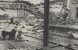 Bloody Saturday (Chinese: 血腥的星期六; pinyin: Xuèxīng de Xīngqíliù) is a black-and-white photograph taken on 28 August 1937, a few minutes after a Japanese air attack struck civilians during the Battle of Shanghai in the Second Sino-Japanese War. Depicting a Chinese baby crying within the bombed-out ruins of Shanghai South railway station, the photograph became known as a cultural icon demonstrating Japanese wartime atrocities in China. The photograph was widely published, and in less than a month had been seen by more than 136 million viewers.[1] The photographer, Hearst Corporation's H. S. "Newsreel" Wong, also known as Wong Hai-Sheng or Wang Xiaoting, did not discover the identity or even the sex of the injured child, whose mother lay dead nearby. The baby was called Ping Mei.[2] One of the most memorable war photographs ever published, and perhaps the most famous newsreel scene of the 1930s,[3] the image stimulated an outpouring of Western anger against Japanese violence in China.[4] Journalist Harold Isaacs called the iconic image "one of the most successful 'propaganda' pieces of all time".[5]