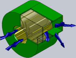 The centrifugal fan has a drum shape composed of a number of fan blades mounted around a hub. As shown in the animated figure, the hub turns on a driveshaft mounted in bearings in the fan housing. The gas enters from the side of the fan wheel, turns 90 degrees and accelerates due to centrifugal force as it flows over the fan blades and exits the fan housing.[11]