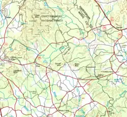 Blue Creek rises in central White County, Georgia, just northeast of Cleveland and just east of State Route 75.[2] The creek runs south and southeast until it crosses State Route 255, then turns northeast and back to the east, before flowing into the Chattahoochee River less than 1 mile south of the confluence of Amys Creek and the Chattahoochee.[3]