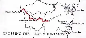 The 1813 crossing of the Blue Mountains by Gregory Blaxland, William Lawson and William Charles Wentworth is officially credited as the first successful European crossing.[33] Blaxland set out with Lawson and Wentworth on 11 May 1813 and succeeded in crossing the mountains by 31 May. They ventured as far as to what is now Mount Blaxland, just west of Coxs River.