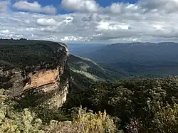 The Blue Mountains (Gundungurra/Dharug: Colomatta or Gulumada)[4][5] are a mountainous region and a mountain range located in New South Wales, Australia. The region is considered to be part of the western outskirts of the Greater Sydney area. The region borders on Sydney's main metropolitan area, its foothills starting about 50 kilometres (31 mi) west of centre of the state capital, close to Penrith.[6] The public's understanding of the extent of the Blue Mountains is varied, as it forms only part of an extensive mountainous area associated with the Great Dividing Range.[7] As defined in 1970, the Blue Mountains region is bounded by the Nepean and Hawkesbury rivers in the east, the Coxs River and Lake Burragorang to the west and south, and the Wolgan and Colo rivers to the north.[8] Geologically, it is situated in the central parts of the Sydney Basin.[9]