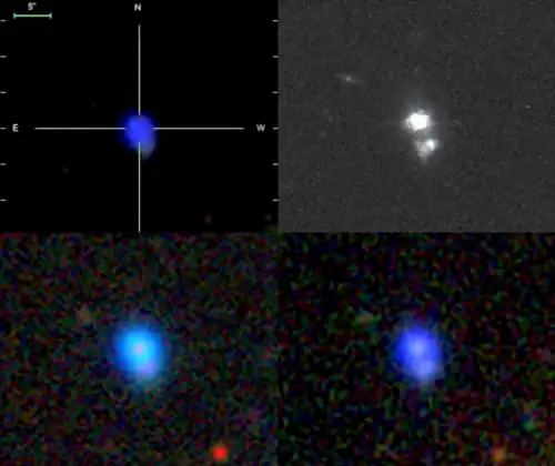 In a 2011 study, Izotov et al. classified BBs as 'Luminous Compact Galaxies' but did not refer to them by name, stating that blue, purple and green Pea galaxies were the same type of object at distances between redshifts z=~0.02 to ~0.63.[32][33]