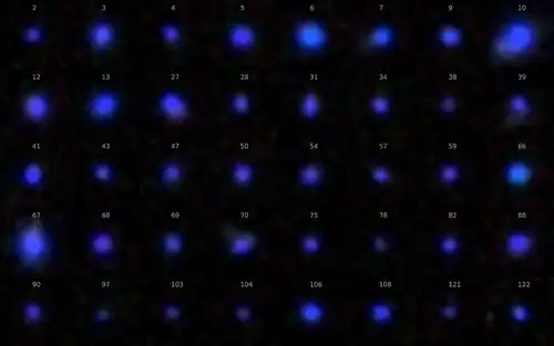 Purple Pea galaxies (PPs) are counterparts of Green Pea galaxies and Blueberry galaxies, often being termed 'Purple Grapes'.[9][3][10] The PPs sample shown in the image to the right has 15 dwarf starburst galaxies and was taken from a list on the Galaxy Zoo website.[7][8] As in other samples, these PPs are at a distance of redshit 0.05 ≤ z < 0.112 which places them about halfway in distance between GPs and BBs.[9] The 24 galaxies named 'Purple marbles' in Hidalgo-Gámez et al. 2017a are at an average distance of redshift z = 0.09 and so fall within the range of PPs.[34]