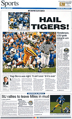 The sports page of the Baton Rouge Advocate on November 10, 2002, the day after the "Bluegrass Miracle." The top photo shows Kentucky defenders deflecting the pass, and the large center photo shows LSU wide receiver Devery Henderson right after catching the pass for the walk-off touchdown.