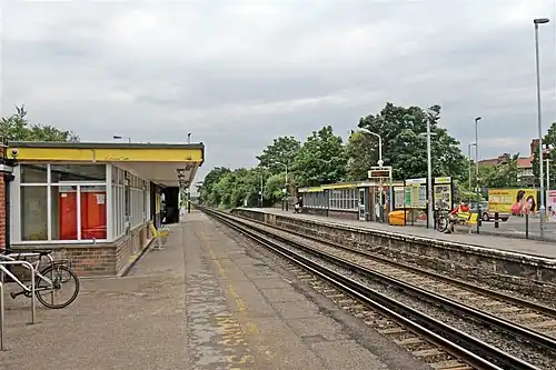 The station was extensively rebuilt in 1882.[1] There were two platforms with substantial awnings. The down side buildings were of brick and stone construction whilst the up side were wooden.[b][7]
